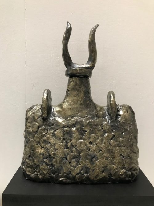Gemaakt van grove chamotte klei met metaal effect glazuur, wat lijkt op brons. De stop heeft een horens detail.